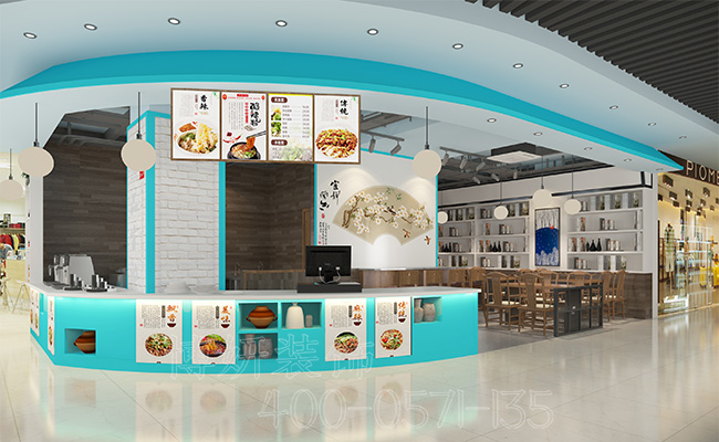 这是一家酸辣粉店装修设计效果图,整体看上去就非常的令人食欲大增。外面采用浅蓝色系,更加的招人眼球,内部选择深色系的装修色彩,更加自然、亲切。旁边色系的墙壁上摆放着各式各样的饮料,非常方便供顾客选择。